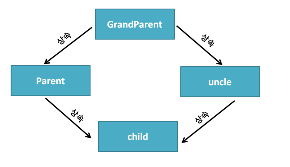 * 결국 child는 Parent와 uncle를 상속 받기는 했지만, GrandParent클래스를 두 번이나 상속 받는 일이 발생.