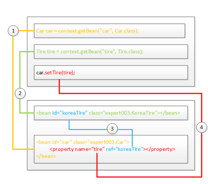 Driver.java에서 car.setTire(tire)라고 하던 부분은 XML 파일의 property 태그를 이용해 대체하는 것이다.
