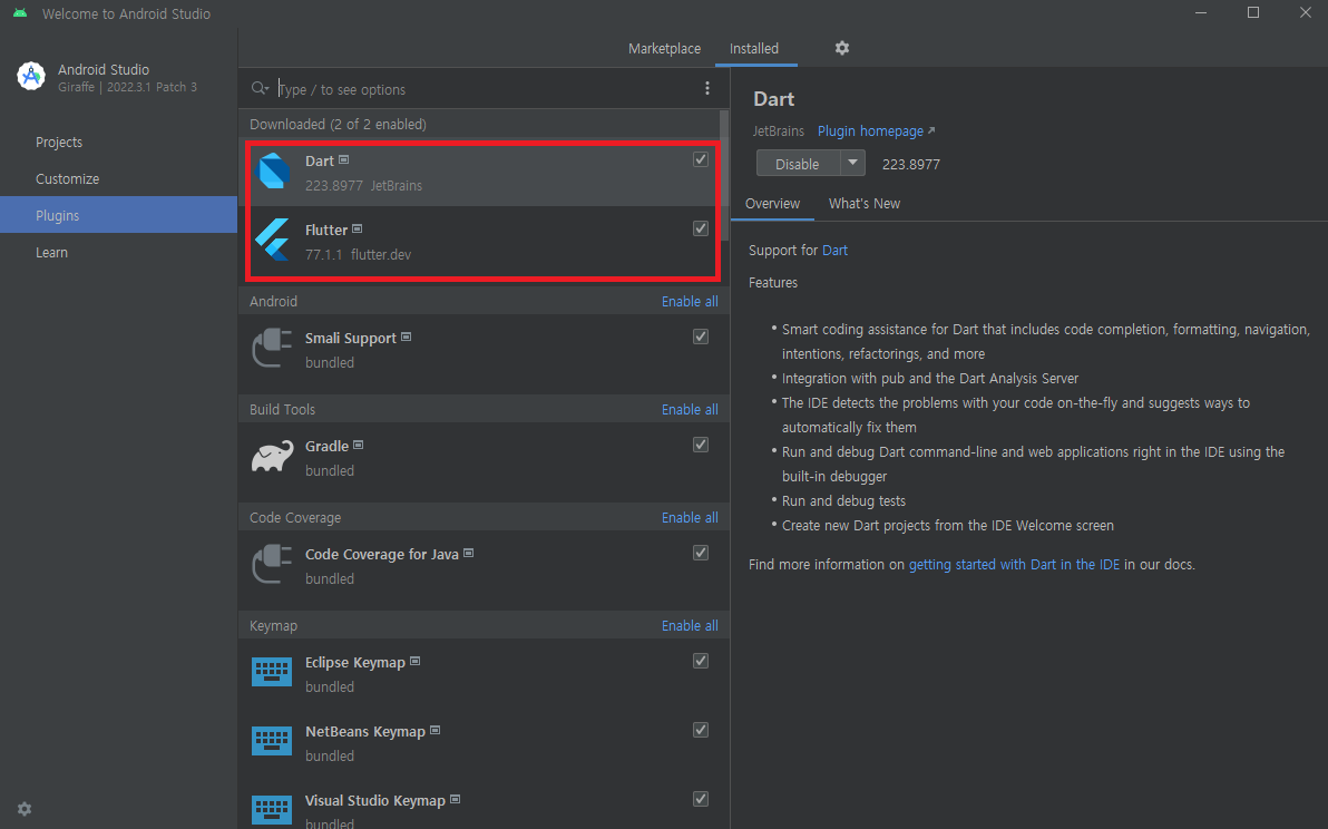 플러그인 설치 (Dart, Flutter)