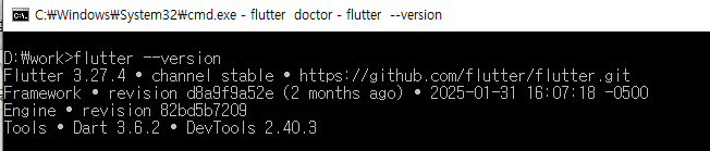 3. cmd창에 flutter --version 명령어 또는 flutter doctor를 치면 설치확인이 가능하다.